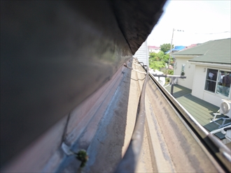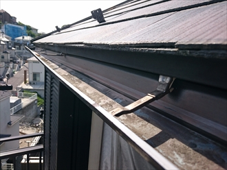 屋根の状態を確認してカバー工事をご提案しましたが、他にも気になる部分があります。軒先に吊ってある雨樋が外側に曲がっていました。普通の状態であればこの様に曲がる事はありませんが、屋根から雪が落ちる際に雪の重さで雨樋を曲げてしまう事があります。この状態ですと、雨が降るたびに雨水がバシャバシャと落ちてしまい、建物への悪影響が出ますのでなおさなければなりませんが、雨樋を直す時には足場が必要になりますので、屋根工事と一緒に足場が必要な部分は直していきましょう。横浜市神奈川区のスレート屋根は、2回目の塗装工事が出来るかどうか調べましたが、築年数を考えてカバー工事をご提案しました。建物全体を考えて、一番最適なご提案をさせて頂いておりますので、ご質問やご不明な点など御座いましたら、フリーダイヤル0120-989-742までお気軽にご相談・お問合せください。