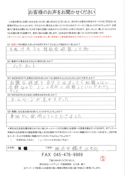 横浜市鶴見区で屋根工事を行ったお客様の声