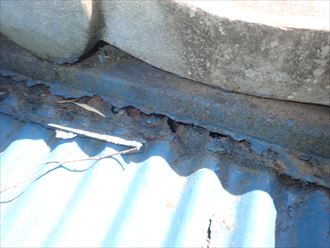 表面に塗られた塗膜がすっかり劣化してしまい、ところどころはく離してしまってスレートの素地が見えてしまっています。
