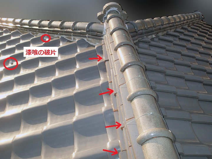 色が変化しているところが剥がれて飛散した部分。剥がれている部分に規則性を感じられるので、特に風当たりが強かったのかもしれません。