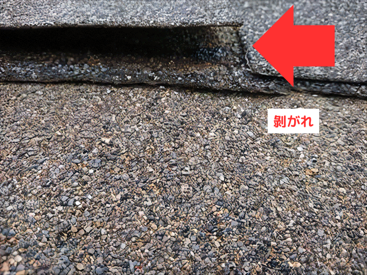 劣化が進み、アスファルトシングルの表面が崩れてきたケース。下地のフェルト紙が露出してしまっている。こうなると雨水はフェルト紙を通過し、内部へと入り込んでいく。