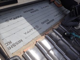 野地板、防水紙、その上は屋根材と密着した作りになっています。屋根材の外側と小屋裏の温度差が多いと内部に結露が発生する恐れがあります。