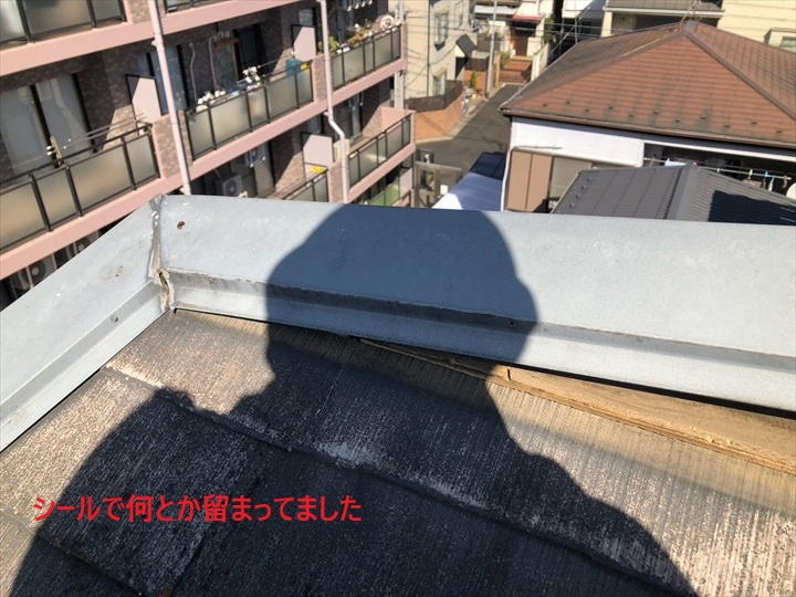 棟板金の取り合い部分にシールを打つのですが、そのシールでなんとか踏みとどまっている状況でした、、、