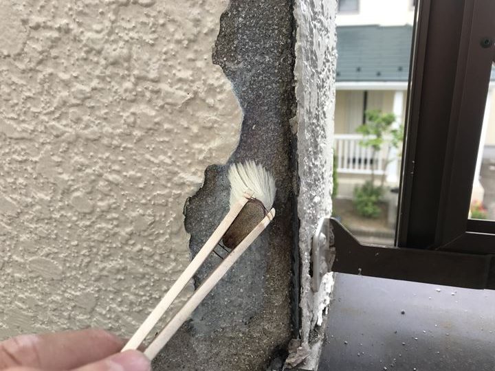 今回破損した場所は笠木の継ぎ目となる部分の下にあたる場所です、金木から壁内側に侵入してしまった雨水が長年に渡り外壁のモルタル資材を劣化させていた模様です。補償対象外ですがこのまま破損してしまったままですと、下地を悪くしてしまう一方なので補修致します。まずモルタル部分にはコンクリート硬化剤を塗り込ませこれ以上強度が落ちない様にします。又表面のシーラー材としての役割があるため補修するモルタルやパテなどが密着するように致しました。