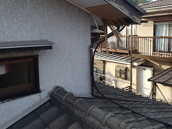 2階の軒先ですので梯子を架けての高所作業となります。危険が伴いますので、こういった点検作業はプロにお任せしたいところです。街の屋根やさんの無料点検をこういう時にこそご活用ください。