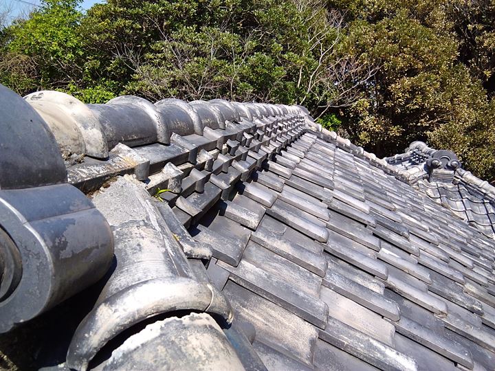 棟瓦の積み重なる部分には屋根土と漆喰により形成していますが、補強がされているものではないので強度的には強くはありません。大きな突風などで破損してしまう瓦には屋根土が長年の劣化により流れ出してしまって、土台が形成されているものは少なく内部が空になっている事が多くあります。基本瓦屋根は瓦の自重で屋根を形成してますので屋根自体は重くなっています。瓦が破損すると言う事は自然災害などで屋根に負担がかかりすぎている事を示します。特に地震などでは建物の倒壊を防ぐために、瓦が落下するように取り付けてあり、現在のモダン建築は強い地震にも耐えれるように耐震補強されていますが、当時の日本家屋はある程度柔軟に作られてあり瓦を犠牲にして落下させ、建物を維持するように作られてありました。
