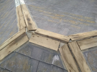 飛散された棟板金以外もくまなく点検を行ったところ、飛散していないものの釘が浮いたり、既に抜けている棟板金も見受けられました。実際に棟板金を外したところ、板金で覆われていた部分の下地の貫板(ぬきいた)の劣化が進んでいる状態でした。今まで、貫板(ぬきいた)には木材が多く使用されていました。木材は水分によって腐食し、経年劣化もあるため定期的な交換が必要になります。今回のように、棟板金が飛散して初めて貫板の劣化が分かるというケースも多いです。