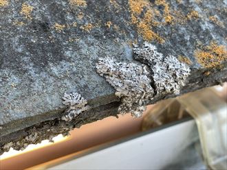屋根の木口には、苔やカビの発生が多く見られました。苔やカビの発生は、屋根材の表面塗膜の劣化により水切れが悪くなってしまっている状態になります。また、屋根材の反りが見られ屋根の重なり部分に隙間が開いている部分が多く見られました。屋根が反ってしまうと風の影響を受け安くなったり乗った際に割れやすくなってしまいます。