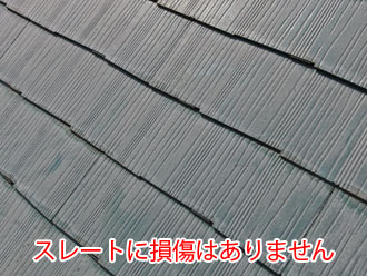 屋根材には一般的なスレートが使われています。屋根の色がやや白っぽくなっている印象を受けますが、これはチョーキング現象という塗膜の劣化によるものです。塗装は劣化することで成分が分離を始め、屋根表面に白い粉が発生するようになります。このようなチョーキング現象の発生は美観に影響を与えるほか、塗装が劣化しているということになりますので放置すると屋根材自体の劣化にも繋がるため注意が必要です。