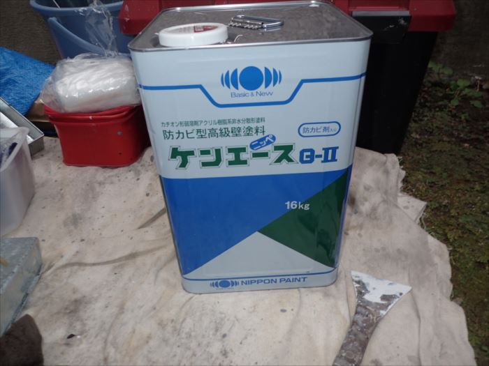 今回の軒天に仕上げ材として塗装を致しました。塗料は日本ペイントのケンエースG-2です。ケンエースはヤニ・しみ止め効果と優れた付着性、防藻・防かびに特化しているため、軒天に特に適した塗料と言っても良いほどです。低汚染なので室内にも使用できる、カチオン形弱溶剤アクリル樹脂系非水分散形塗料です。