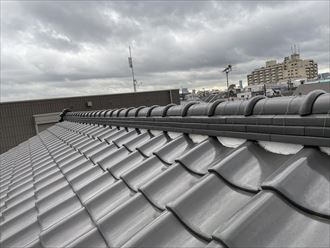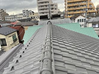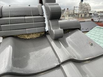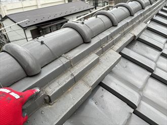 棟自体には歪み等の症状は見られません。冠を固定している導線も切れている箇所は無く問題ありません。しかし、のし瓦が3枚程ズレてしまっておりました。以前のメンテナンスの際にコーキング材で落下しないように固定されておりましたが元々の位置からズレているのではみ出している瓦が雨の受けになり雨水の浸入リスクが高い状態になっております。