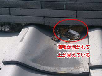 まずは工事前の状態を見て見ましょう。左写真は棟部分の漆喰ですが、漆喰が剥がれて中の土が露出しています。他の箇所を見てみても同様に剥がれがあちこちで見られています。屋根の状態は普段あまり気にすることがないと思いますし、実際に点検をしようと思っても屋根に上ったりするのは危険が伴います。時間が経つとお住まいは何かしら不具合が出るものですので、何も不具合が感じられない場合も年数が経っているのであれば専門業者に見てもらうことをお勧めします。