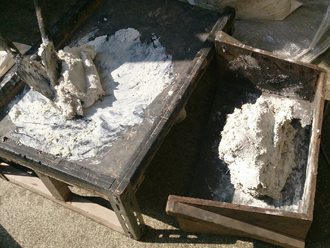 今回使用する漆喰「水シャット」です。屋根用ですので夏場の強烈な紫外線や高温、また風雨にさらされるといった過酷な環境に耐えられる漆喰で、さらにこの製品はシリコンが使われているので、水をはじき汚れなども付着も防ぐことができます。