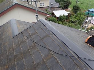 化粧スレート(コロニアル/カラーベスト)の屋根の面と面が合わさる「山」部分は、金属の棟板金で覆われています。屋根のてっぺんに横長に設置されているのは大棟(おおむね)の棟板金で、そこから四隅など下方向へ設置されているのが隅棟(すみむね/下り棟)の棟板金となります。