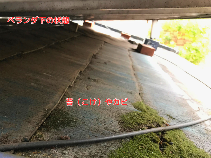 スレート(カラーベスト・コロニアル)屋根のほか、セメント瓦やコンクリート瓦(モニエル瓦)の屋根で、水切れが悪くなったときに生えます。また、粘土瓦の屋根でも土が溜まり、日当りが悪ければ、苔が繁殖することがあります。そのほか、水はけがよくないベランダやバルコニーの床、排水路でも苔は発生します。