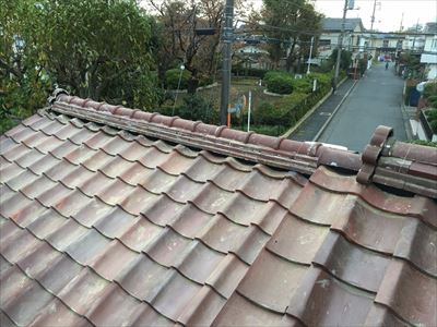 約築40年というお客様より「そろそろ屋根を新しくしたい」とご相談を承りました。何でも「築年数を考えて、そろそろ屋根を軽量化したい」といいうことです。点検したところ、瓦の下に葺土を用いて安定させる土葺き工法で葺かれた屋根でした。この葺き土を撤去し、から葺き(桟葺き)工法に変更すれば、瓦屋根でも総重量を3分の2から2分の1程度にまで減らすことができます。今回はそれに加えて防災瓦を使用し、災害に強い屋根へと変更します。