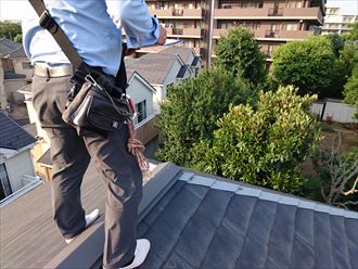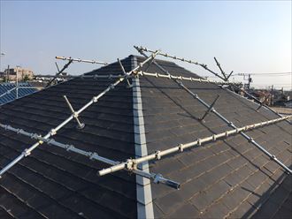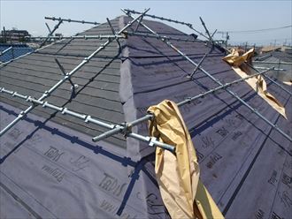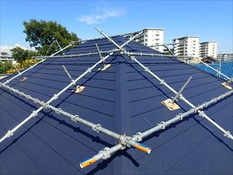 勾配が急ですと施工が出来ません。まずは屋根足場を取付け施工をしていきます。屋根カバー工法は葺き替え工事と違い、既存の屋根を剥がさずに重ね張りをします。