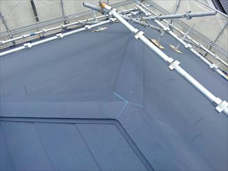屋根カバー完了です。スーパーガルテクトは遮熱性鋼板と断熱材を一体化にした屋根材になります。ちぢみ塗装の屋根材は意匠性に富んでおり、綺麗な外観を一層引き立ててくれます。