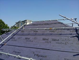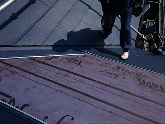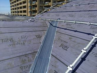 その後ルーフィングを軒から張り重ねていきます。今回は遅延型粘着層ルーフィングを使用します。通常のルーフィングは粘着ではなく、タッカーで留めていくのですが勾配が急な為作業が難しい為、粘着式のタディスセルフを使用します。