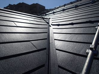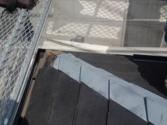 役物を取付け施工を進めていきますが、スレート屋根の場合は谷や棟には板金が使用されていて、屋根材とは全く違う素材でした。これは雪止めもそうです。