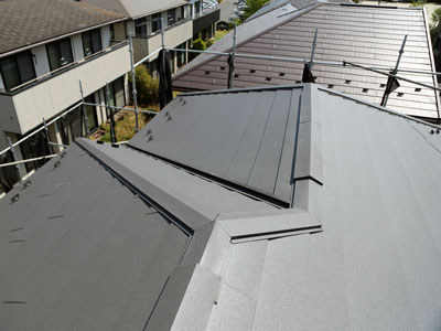 エコグラーニでの葺き替えが完了しました。瓦屋根は1㎡あたり約60kgの重さがあります。それに対してエコグラーニは約5.8kgです。屋根の重さが約1/10になりましたので、地震にも強くなりました。雨漏りも解決しましたし、安心してお過ごしできると思います。