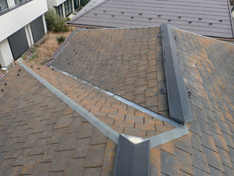 最近、雨漏りするようになってしまったという瓦屋根です。もちろん、雨漏りの原因が屋根とは限られないのですが、いろいろと問題を抱えているようです。屋根の形状は寄棟なのですが、下り棟と大棟の隣接する部分が漆喰で覆われていないことが気になります。ここから雨水が浸入すると、冠瓦と熨斗(のし)瓦を支えている葺き土が流れてしまい、棟が支えきれなくなってしまいます。