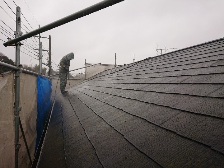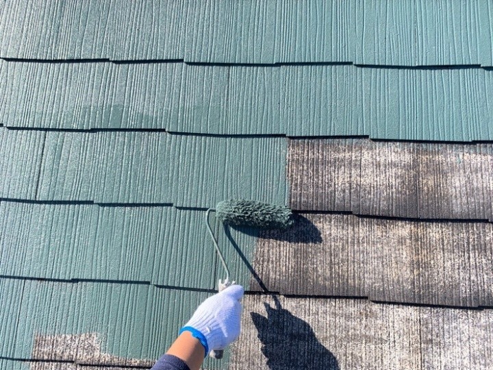 まずは下塗りで、屋根材の吸い込みを抑え、塗料の密着性を高めます。