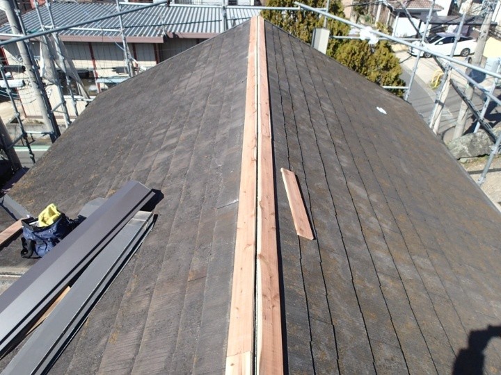 残っていた貫板も劣化していたため、すべて取り外し、新しい貫板と棟板金に交換します。