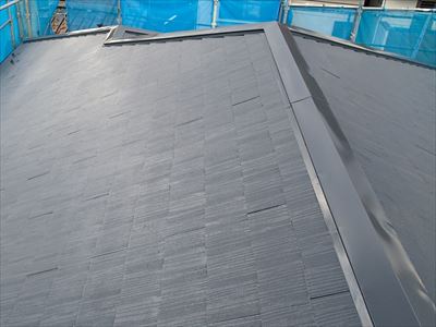 棟板金の設置が完了し、スーパーガルテクトによる屋根葺き替え工事は無事に竣工しました。