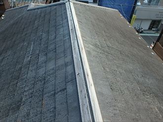 施工では、既存の棟板金を取り外し、スレートの上に防水紙を敷設します。