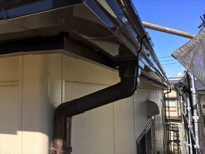 雨樋や霧除けなどの付帯部については、日本ペイントのファインSi(ブラック)で仕上げ、外観全体が引き締まった印象となっています。