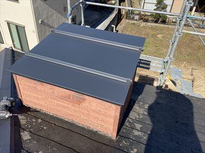 板金の繋ぎ目にはシーリングをして、雨水が浸入することを防止します。頂点まで棟板金を取り付けて、大棟の接合部分にシーリングをしたら、棟板金の取り付けは完了です。
