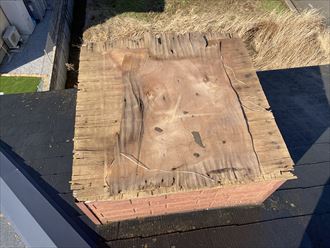 棟板金の部分交換が完了しました。この金属製の鎖、早いうちに取り外した方がいいのですが、野地板も貫通して恐らく棟木まで到達しているのでしょう。穴を完全に塞がなくてはならないので、何かが起こるまでは取り敢えずこのままにしておいて、雨漏りなどが発生したら、下地を完全に補修して屋根葺き替えを行うことになるでしょう。
