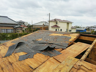 昨年の台風の影響で屋根の一部が破損してしまい、雨漏りがするようになったとの事で、修復工事をお願いしたいとご相談を承りました。