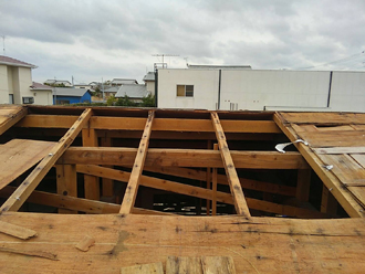防水紙を撤去し、まだ痛みの少ない野地板を残して一旦清掃いたします。