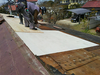 その割れたスレート板を撤去した際、傷んだ野地板と防水紙も撤去したとの事です。