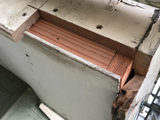違う部分の破風の下端です。こちらは再利用不可能でしたの取り除いて新しく加工したものを使用します。同じく廻り縁を取り付け、そこにボンドと釘で直角三角形の部分を取り付けていきます。こちらも固定後、パテを塗り、隙間を埋め、面を均一にします。