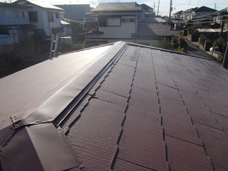 割れた瓦と新しい瓦の交換が完了しました。新しい部分とこれまでの部分は分かりますが、それほど違和感はありませんね。このことからも釉薬瓦がほぼ色褪せないということが分かります。