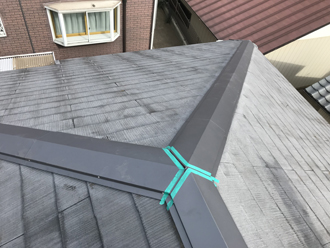 棟板金を取り付けたらつなぎ目にシーリングを打ち、雨水が浸入しないようにいたします。