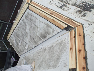 まずは既存の棟板金をすべて撤去いたします。同時に貫板も撤去いたします。劣化しているため乱暴に持ち上げると途中で折れてしまい、破片が飛び散ってしまいますので、慎重に外していきます。