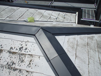 棟の寄り合い部分の合わせ目にコーキングを施して、まずは棟板金の完成です。