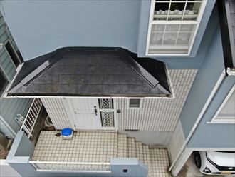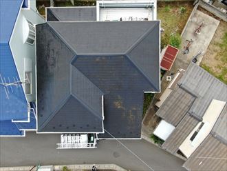 屋根に上る前に調査日は天候にも恵まれたので、ドローンを使用し屋根全体の確認を行いました。屋根は寄棟の形状になっており、北面と南面に下屋根が1つずつ設置せれています。大屋根は多少屋根表面のコケが目立ちましたが、板金の飛散等の症状は確認出来ませんでした。玄関側の下屋根もドローンにて撮影しましたがこの段階ではこちらの板金にも特に問題はありませんでした。