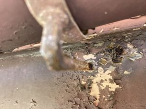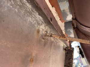 横樋を外し吊金物を切断しますが、同じ場所に何本も同じ吊り具が、刺さって劣化していました。何度も修復していたものです、吊り具はどこでも設置して良い物でもなく、打ち込み式の吊り具は破風板を貫通させ破風板裏側にある屋根垂木に打ち込む様に設置させるため、どうしても設置する場所が同じ似た場所になってしまいます。
