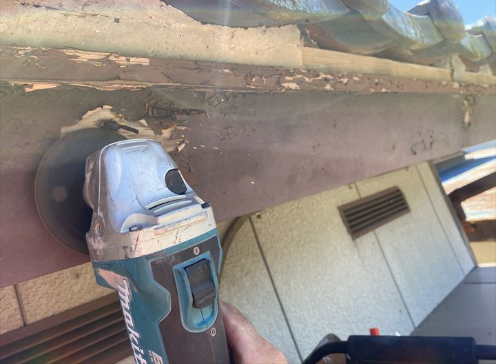 工事は元々設置してある雨樋を綺麗に取り除くことから工事が始まります、破風板に打ち込み式の吊り具が使用していましたが、根元から錆びて折れてしまっている事から、撤去が出来ませんので、グラインダーを使用して、切断いたします。