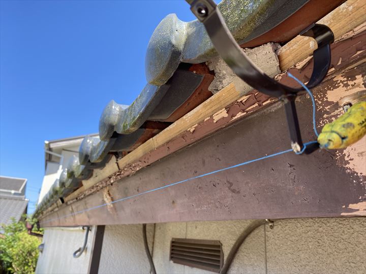 工事の手順とすると、まず雨水が詰まらない様に上手く雨水が流れる設置しなくてはいけない為、両端に設置した吊り具に、水糸を流し水平を出します。ただ水が流れるには水勾配と言い、少なくても1/100勾配が必要になってきます。1/100勾配とは1m幅で1cmの勾配が必要となりますので、今回の様な3mあれば3cmの落差が必要になってきます。