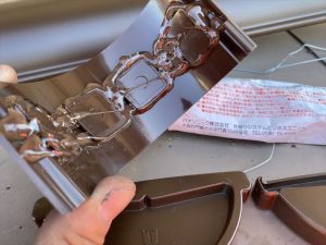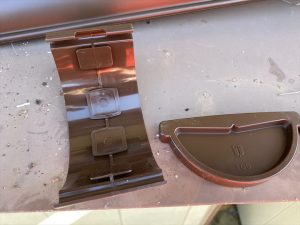 既存雨樋は電化製の半丸雨樋でしたので、今回使用した雨樋もデンカ製の雨樋を使用いたしました。デンカ製の雨樋は継ぎ目部分に入れ込む寸法が決まっておりしっかりと差し込まないと、上手くくっける事が出来ない様になっている為、加工寸法が短くなったりすることが出来ないので、加工する際には慎重になります。