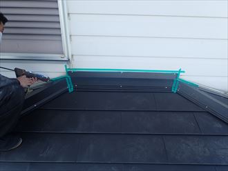 棟板金の重なり部分には、防水処置としてコーキングを充填し、板金を重ね固定していきます。棟板金の固定には、ステンレス製のビスを使用し、約40cm間隔で固定しすべての棟板金を取り付けます。残りの板金の取り付け作業を行います。