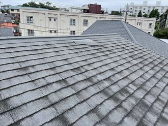 現地調査の様子になります。E様邸は築13年が経過した建物になり屋根にはスレートが使用されておりました。スレートはセメントを主成分として形成されている屋根材となります。表面が塗装によって撥水性が付与されていますので定期的なメンテナンスが必要な屋根材となります。