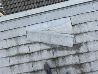 E様邸のスレートは、これまでメンテナンスを行っていませんでしたので全体的な塗装の劣化症状が発生しておりました。また、スレート1枚に破損が見られスレートがズレてしまっている状態でした。屋根材が固定されていない状態になっていたので落下の可能性があり危険な状態になります。