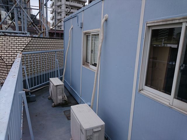 保険申請が無事に完了しましたので工事に入ります。今回はトップライトの交換とプレハブの塗装工事、エアコンダクトもボロボロになっていましたので巻き直しの工事を行いました。